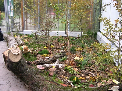 Zunächst bildeten wir in zwei schräg gegenüberliegenden Ecken jeweils ein Laubwald- und ein Nadelwaldbiotop nach. Hierzu lieh uns der Botanische Garten mehrere Stammstücke als Begrenzung. Dann ging es ans Präparieren der Ständer mit den tags zuvor geschnittenen Bäumen. Anschließend wurden noch ein paar Styrodurplatten ausgelegt. Zum Schluss deckten wir die Biotopflächen mit Mulchschnitzel ab und legten bereits die ersten Äste und Zweige mit Pilzen hinein.