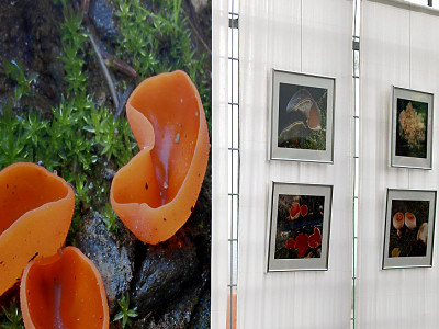 | Bild 17: Zu den Hinguckern zählten die im Ausstellungsraum verteilten Bildfahnen und gerahmten Digitalaufnahmen. | Bild 18: Interessante und teils seltene Schwammerln hielten die Helfer während der gesamten Ausstellung auf Trab. |