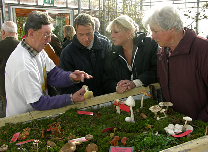 | Bild 7: Auf dem Handkarren war eine kleine Auswahl an Giftpilzen konzentriert, die auf reges Interesse stieß. | Bild 8: Fritz Frank erklärt den umstehenden Pilzfreunden die Merkmale des berüchtigten Grünen Knollenblätterpilzes. |