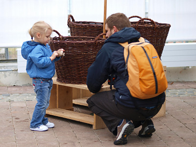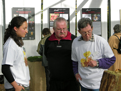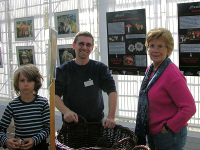 | Bild 21: DGfM-Poster dienten als Info, in den Körben davor warteten Porlinge darauf, in die Hand genommen zu werden. | Bild 22: Lutz Vollbracht (Mitte) betreute am Sonntag zeitweilig die Station mit den Pilzen zum Anfassen. |