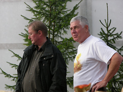| Bild 5: Die verkleidete und begrünte Palettenlandschaft war mit zahlreichen Frischpilzen bestückt. | Bild 6: Unser Kassierer Hans Ruider denkt an die Kosten; der Vize Rainer Kraus zeigt sich nach dem Aufbau zufrieden. |