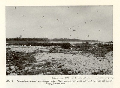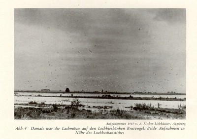 Welch buntes Vogelleben einst an den Lechinseln geherrscht haben muß, geht aus der lebendigen Schilderung von A. F i s c h e r hervor: „In dichten Massen flogen vor unserer Landung die zu vielen hunderten brütenden Möwen auf, Nest an Nest stand hier wieder an manchen Stellen so dicht nebeneinander, daß man Mühe hatte keine Eier zu zertreten. Gruppenweise rannten die Möwen dem unteren Teil der Insel zu, um das schützende Wasser zu erreichen und auf benachbarte niedere Kiesrücken zu schwimmen, begleitet von dem ununterbrochenen Geschrei der alten Möven. Auf dem in der Nähe gelegenen grasarmen, breiten Kiesrücken hatten sich Lach- und Flußseeschwalben, einige Pärchen Rotschenkel und Kiebitze angesiedelt. Aus einem Seitenarme flogen vier alte Fischreiher auf, die mit langsamen Flügelschlägen das Weite suchten. Auf dem ruhigen Wasser zwischen den Kiesbänken schwamm ein Sägerentenweibchen mit ihren sechs Jungen. So war es also ausgerechnet unserer Zeit vorbehalten, daß durch Zerstörung der letzten Lebensmöglichkeiten diese Charaktervögel des Isar- und Lechgebietes zum Abwandern gezwungen wurden.