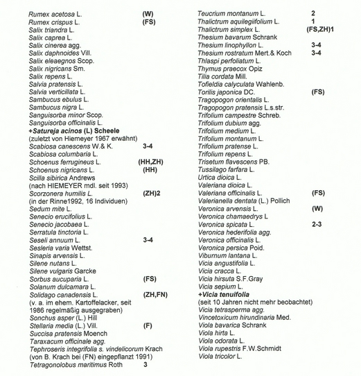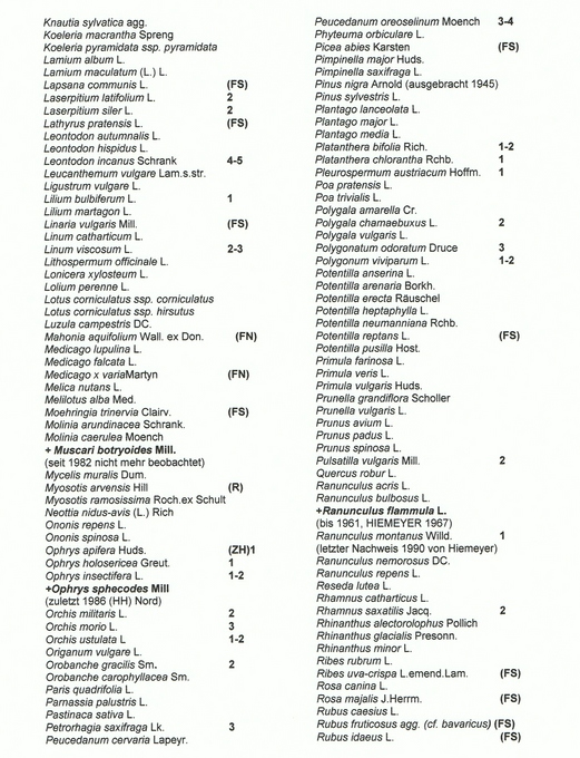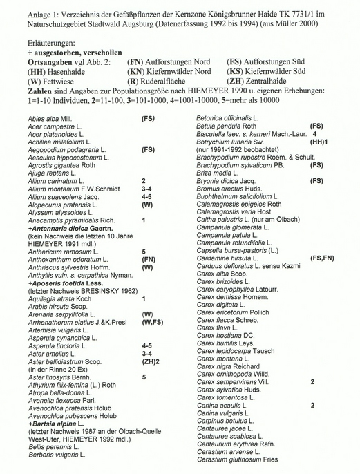 Die vorgestellte Florenliste (siehe Tabelle 1) bezieht sich auf die Kernzone Königsbrunner Haide und umfaßt annähernd 400 Farn- und Blütenpflanzen. Der Artenreichtum ist besonders hoch im Bereich der Zentralhaide. Speziell ist das mit der Standort- und Lebensraumvielfalt auf dieser Fläche zu erklären, generell mit dem Zusammentreffen dealpiner, submediterraner und subkontinentaler Sippen im unteren Lechtal (BRESINSKY 1965, MÜLLER 1990a). Um seltenere und sich ausbreitende Arten zu lokalisieren, wurden in der Liste auch Angaben zum Vorkommen in den Teilgebieten (z. B. ZH = Zentralhaide) gemacht. Außerdem sind von seltenen Arten Angaben zur Populationsgröße vermerkt, die Erhebungen von HIEMEYER (1990) und eigene Untersuchungen bis 1994 zusammenfassen.